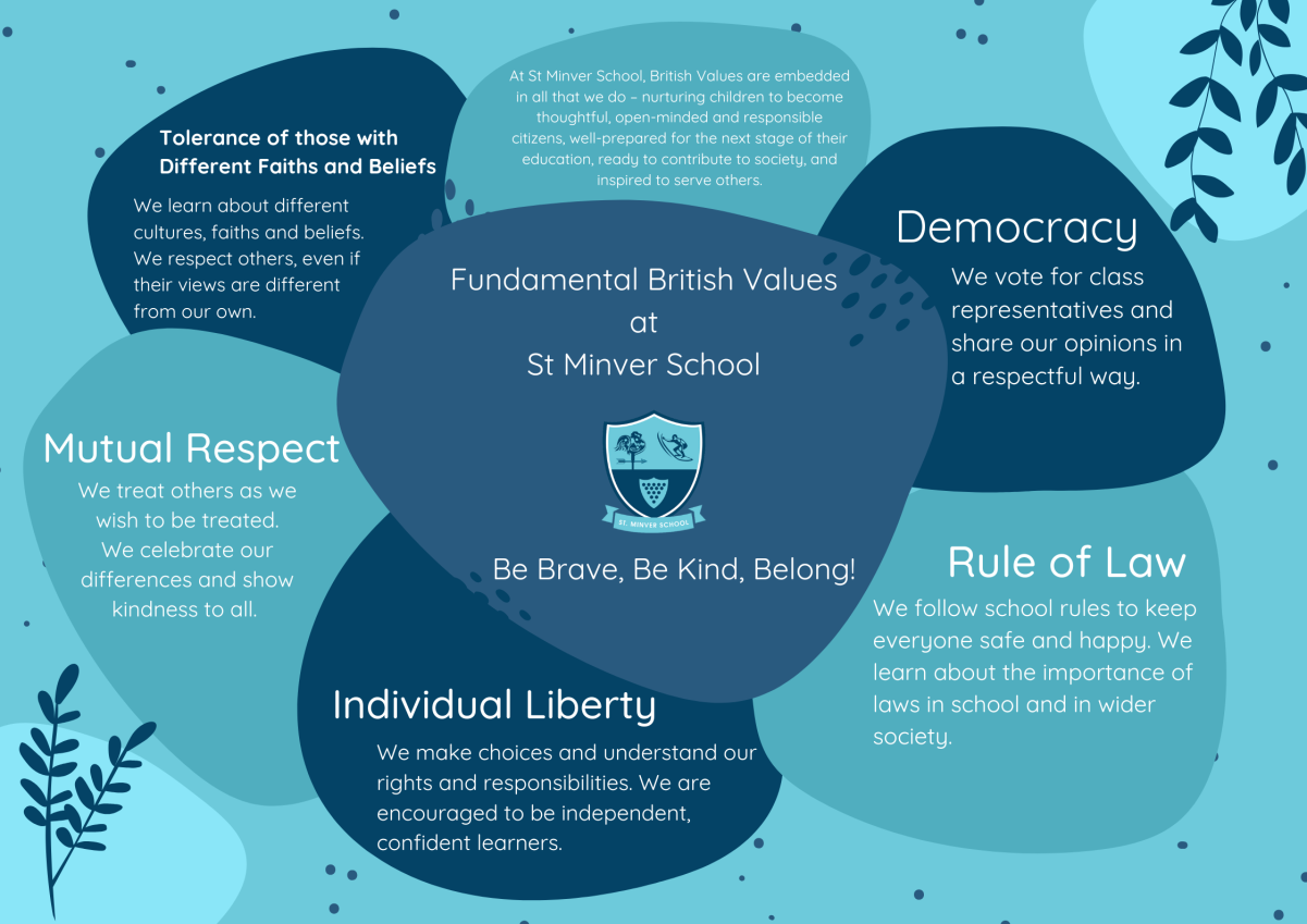 At St Minver School, we actively promote the fundamental British values of democracy, the rule of law, individual liberty, mutual respect, and tolerance of different faiths and beliefs. These values are embedded in our curriculum, assemblies, pupil voice initiatives, and daily school life. Children learn to express opinions, respect rules, make informed choices, and appreciate diversity. Through leadership roles, PSHE, RE, and enrichment activities, we foster a respectful, inclusive community. We are committed to developing responsible citizens who understand their rights and responsibilities, and we challenge any views that go against these core values.